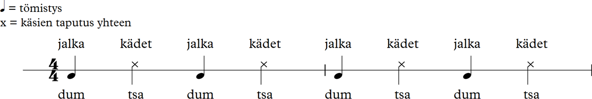 Harjoituksen nimi dum-tsa kuvaa rumpujen ääntä, jota matkitaan jaloilla ja käsillä. Dum tarkoittaa tömistystä, tsa tarkoittaa käsien taputusta yhteen. Tämä kehorytmikuvio sopii hyvin rytmikkääseen, tasajakoiseen musiikkiin, jossa lasketaan kahteen tai neljään. Vuorotellaan siis tömistystä ja taputusta musiikin tahtiin. Tömistäkää yhdellä jalalla tai jalkaa vaihtaen. Sanokaa aluksi tömistyksen kohdalla dum ja taputuksen kohdalla tsa. Tämä tukee rytmin oppimista.