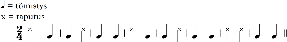 Tämän tehtävän haaste syntyy siitä, että taputuksissa ja tömistyksissä lasketaan kolmeen, vaikka kappale on tasajakoinen.
