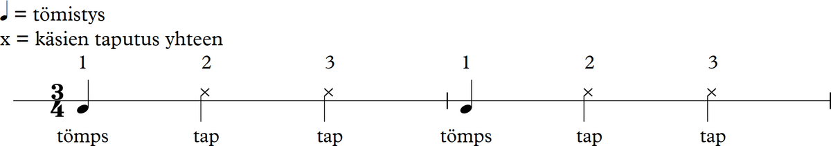 Tehdään kehorytmejä käsillä ja jaloilla. Ensin tömistetään kerran jalalla ja sen jälkeen taputetaan käsiä kaksi kertaa yhteen: tömps tap tap. Tätä toistetaan monta kertaa: jalka, taputus, taputus, jalka, taputus, taputus ja niin edelleen.