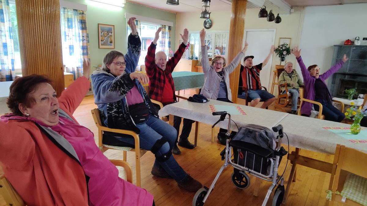 Nostelkaa käsiä oman kunnon mukaan. Jos istutte lähekkäin, voivat osallistujat kääntyä hieman sivuttain, tai kädet voi myös nostaa etukautta ylös, ettei kukaan vahingossa huitaise toista.