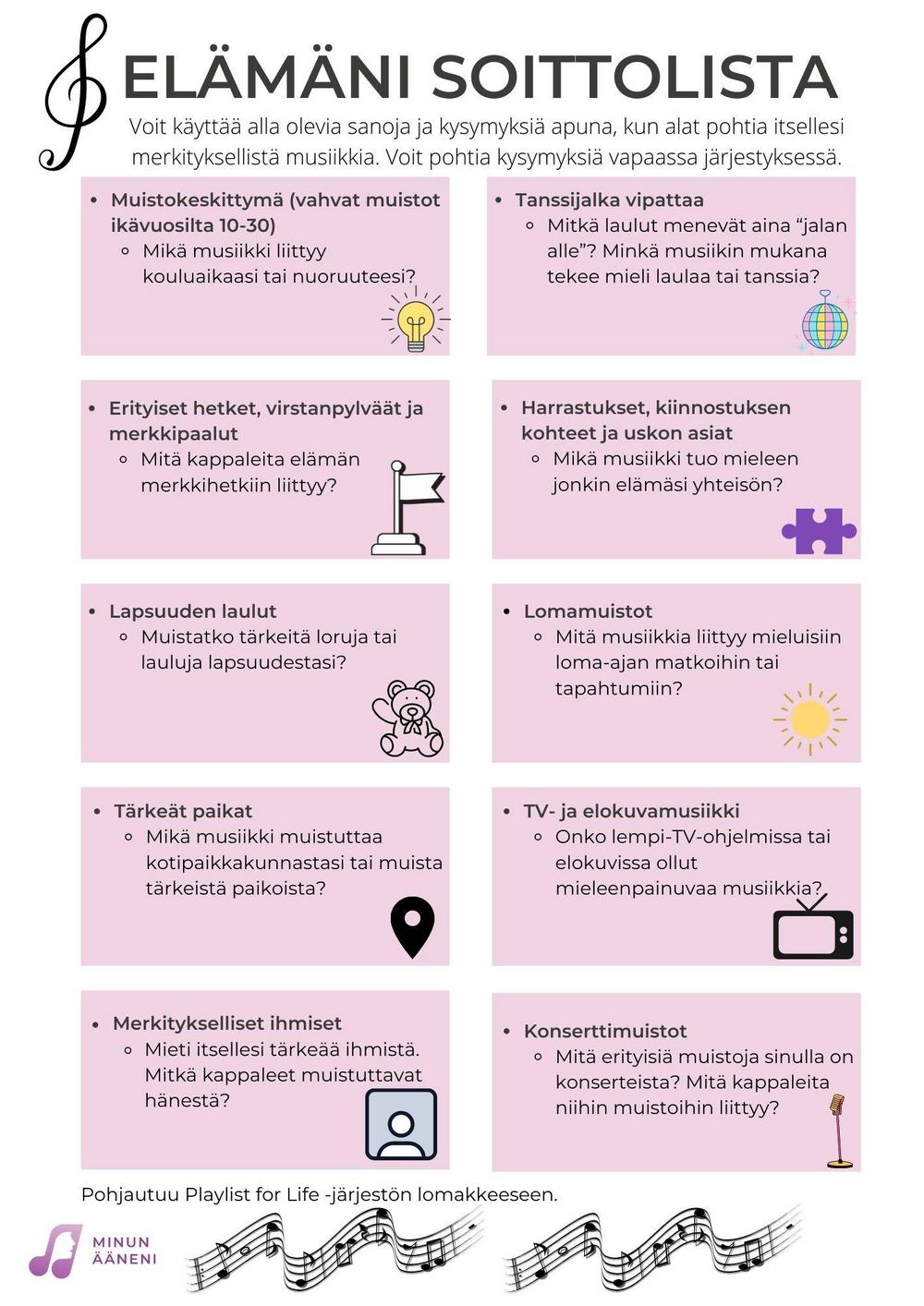 Musiikkimuisto Muistellaan itselle tärkeää ja rakasta kappaletta. Kappale ja muistot voidaan kirjata ylös omaan vihkoon ja niistä keskustellaan.