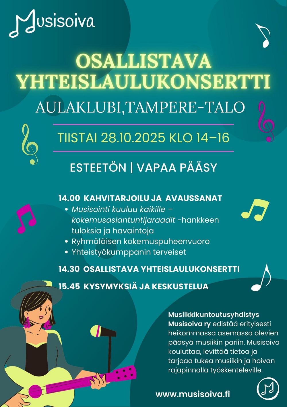 Lämpimästi tervetuloa Musisointi kuuluu kaikille – kokemusasiantuntijaraadit -hankkeen päätöstapahtumaan Tampere-talon Aulaklubille. Tapahtumassa kerromme hankkeen tuloksista ja havainnoista, kuulemme…